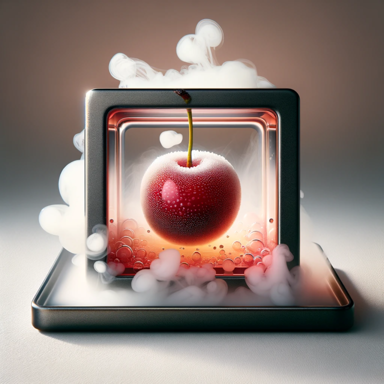 A dramatic presentation of a cherry encapsulated in a square and enveloped by a mist, blending sweetness with a theatrical mist to engage the senses before the first bite.