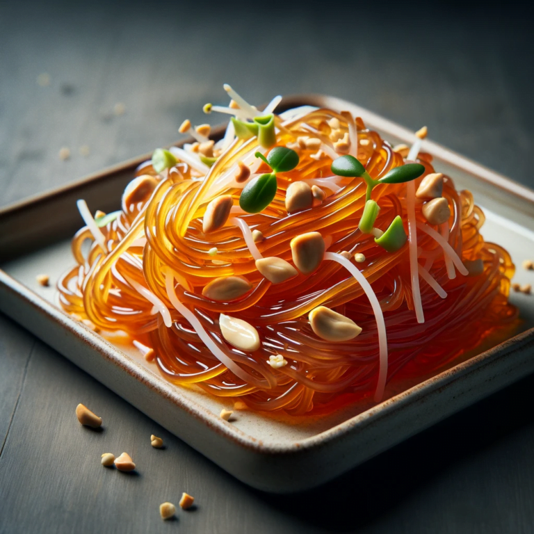 I’ve taken the classic flavors of Pad Thai and reimagined them in a jelly noodle form. The glossy, transparent noodles are topped with sprouts and peanuts, presenting a familiar dish in a completely new visual context.