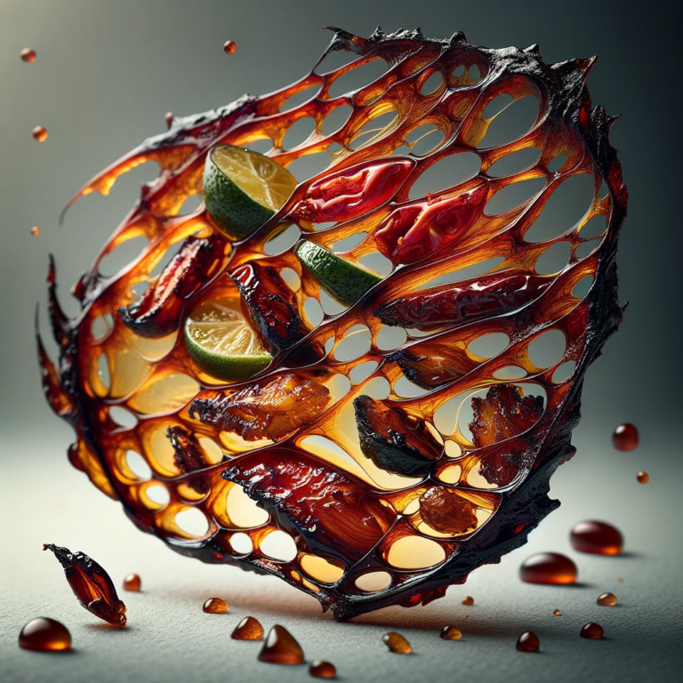My conceptual rendition of Ayam Bakar captures the dish’s essence in a sculptural form. A lattice structure holds elements like lime and chili, symbolizing the dish’s core flavors in an artistic display.