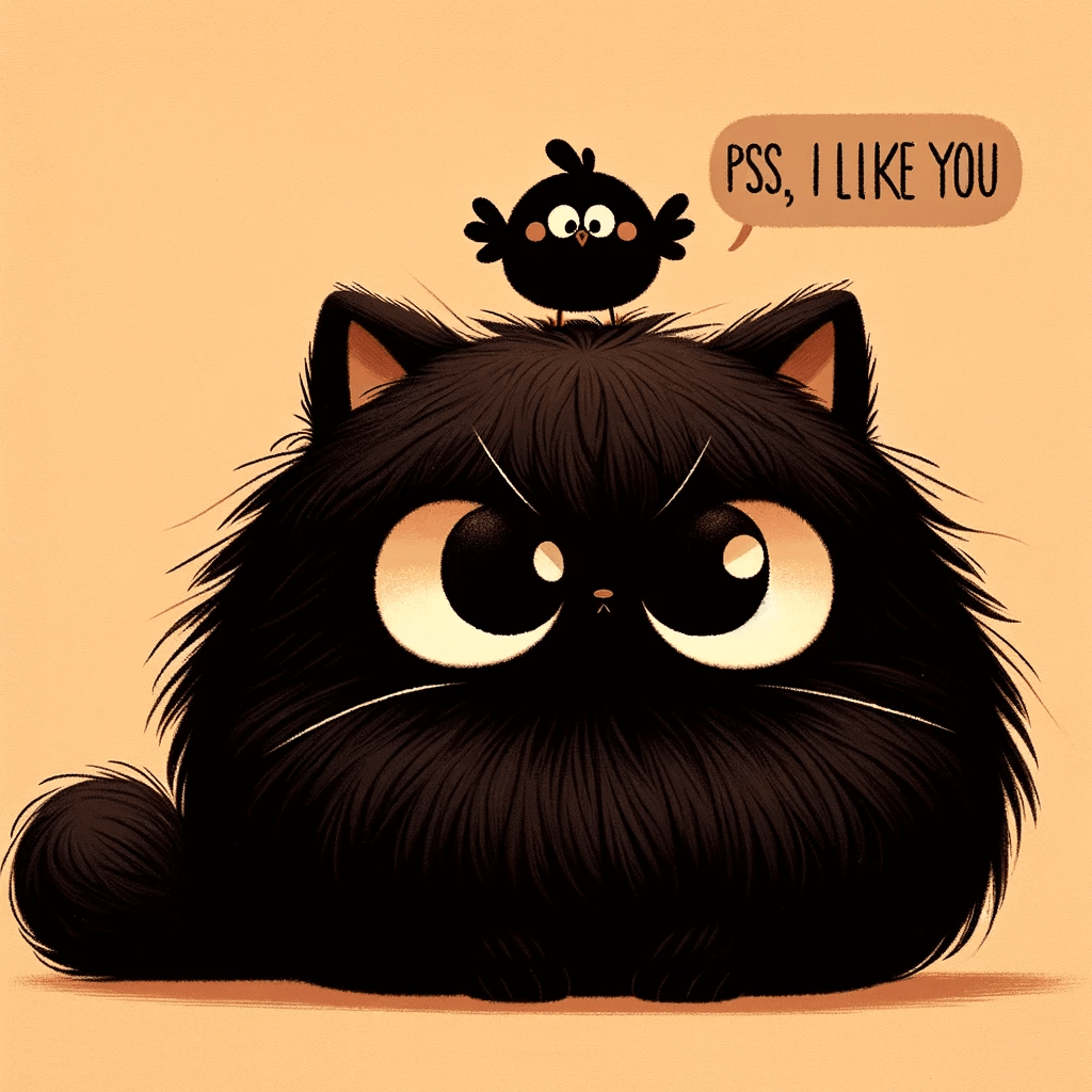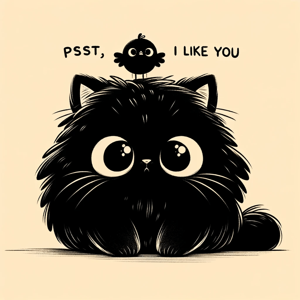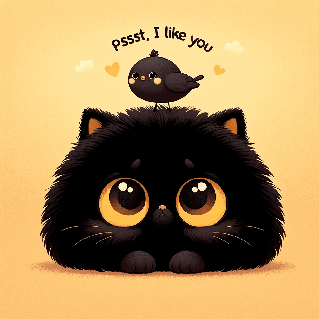 Three delightful images portraying a fluffy black cat with a small, cheerful bird perched on top, accompanied by the playful message ‘Pssst, I like you.’