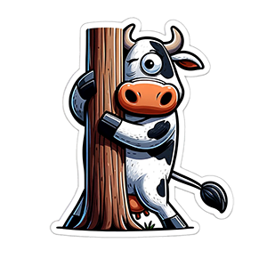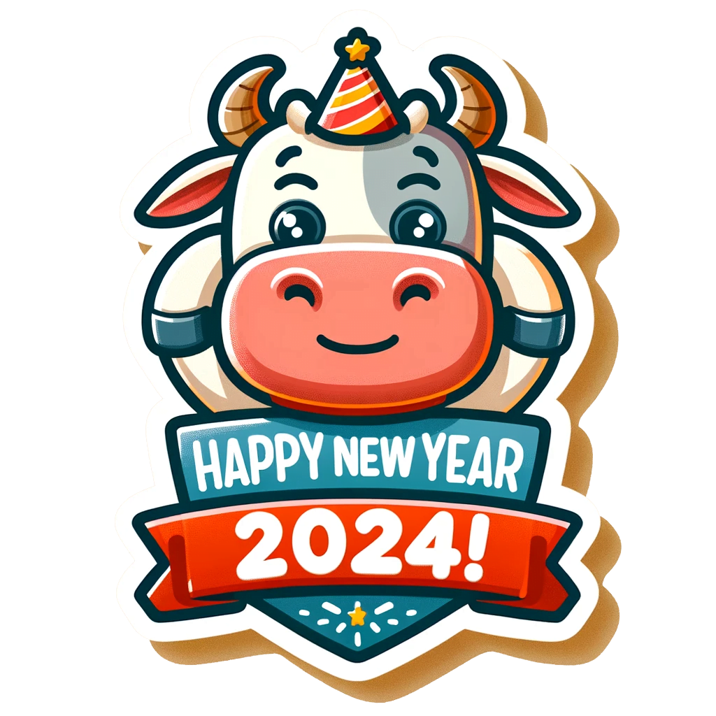 Composition: The sticker has a clear and central focal point, which is the cheerful cow character. The elements are well-balanced, with the “Happy New Year 2024!” banner positioned to anchor the design and draw attention to the message. The party hat on the cow adds a festive touch that is appropriate for the New Year theme. Rating: 3/5